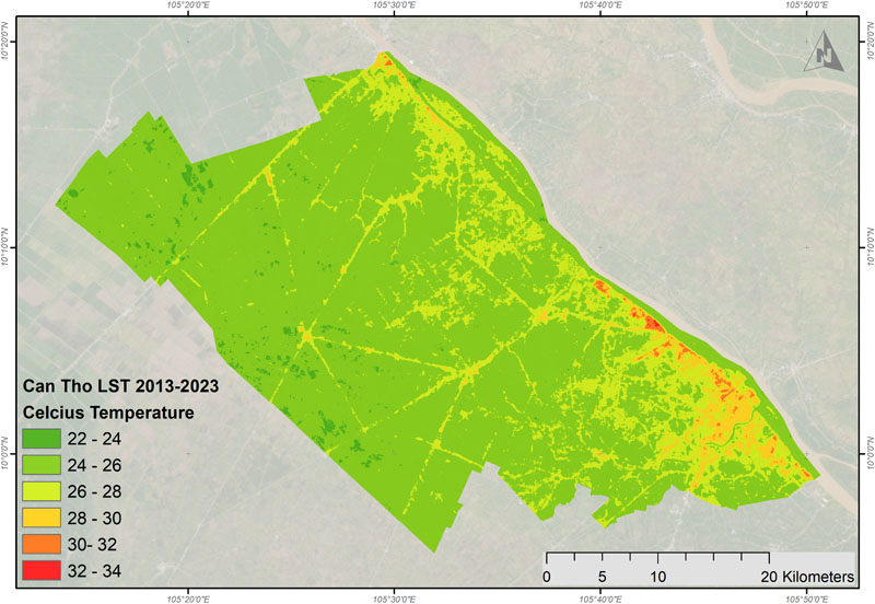 Các phân tích ở bước 4 sẽ tiếp tục đóng góp vào bộ dữ liệu mà địa phương đã xây dựng ở bước 2. Cụ thể, các bản đồ đảo nhiệt đô thị thể hiện qua bản đồ phân bố nhiệt độ bề mặt trung bình của từng năm hoặc trong một giai đoạn 5 – 10 năm sẽ được xây dựng, giúp xác định các vị trí thường xuyên có cường độ đảo nhiệt đô thị cao (các điểm nóng) và những vị trí có cường độ đảo nhiệt thấp hơn. Hình 3 giới thiệu một ví dụ, là bản đồ đảo nhiệt đô thị của TP Cần Thơ trong giai đoạn 2013 – 2023.