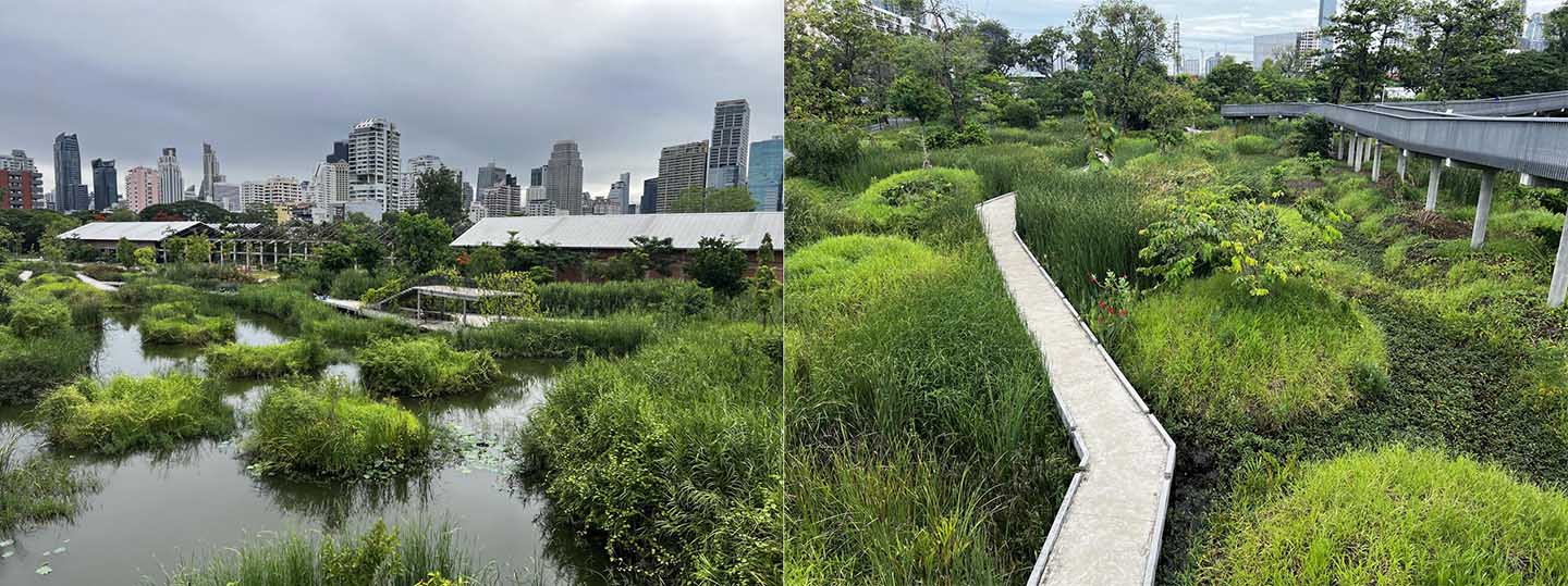 Ngay trong khu vực Đông Nam Á, Thái Lan đã thực hiện một dự án đột phá là chuyển đổi khu nhà máy thuốc lá cũ thành công viên Benjakitti Forest Park (Bangkok, 2022). Turenscape + Arsomsilp Community and Environmental Architect chọn giải pháp can thiệp tối thiểu khi giữ lại các khung nhà máy cũ và chuyển đổi chúng thành sân thể thao và nhà trưng bày. Đặc biệt, các khu vực đất xung quanh nhà máy được chuyển thành đất ngập nước nhằm tái tạo hệ thực vật và động vật bản địa, đồng thời nâng cao tính thẩm thấu của bề mặt đất và giúp điều tiết nước vào mùa mưa. Thành công của dự án còn nằm ở tính bao hàm, khi nó chuyển đổi diện tích đất công nghiệp khô cứng thành một nơi chốn thứ ba, tại đó cư dân địa phương bất kể thu nhập và tuổi tác đều có thể đến tập thể dục, thư giãn và kết nối.